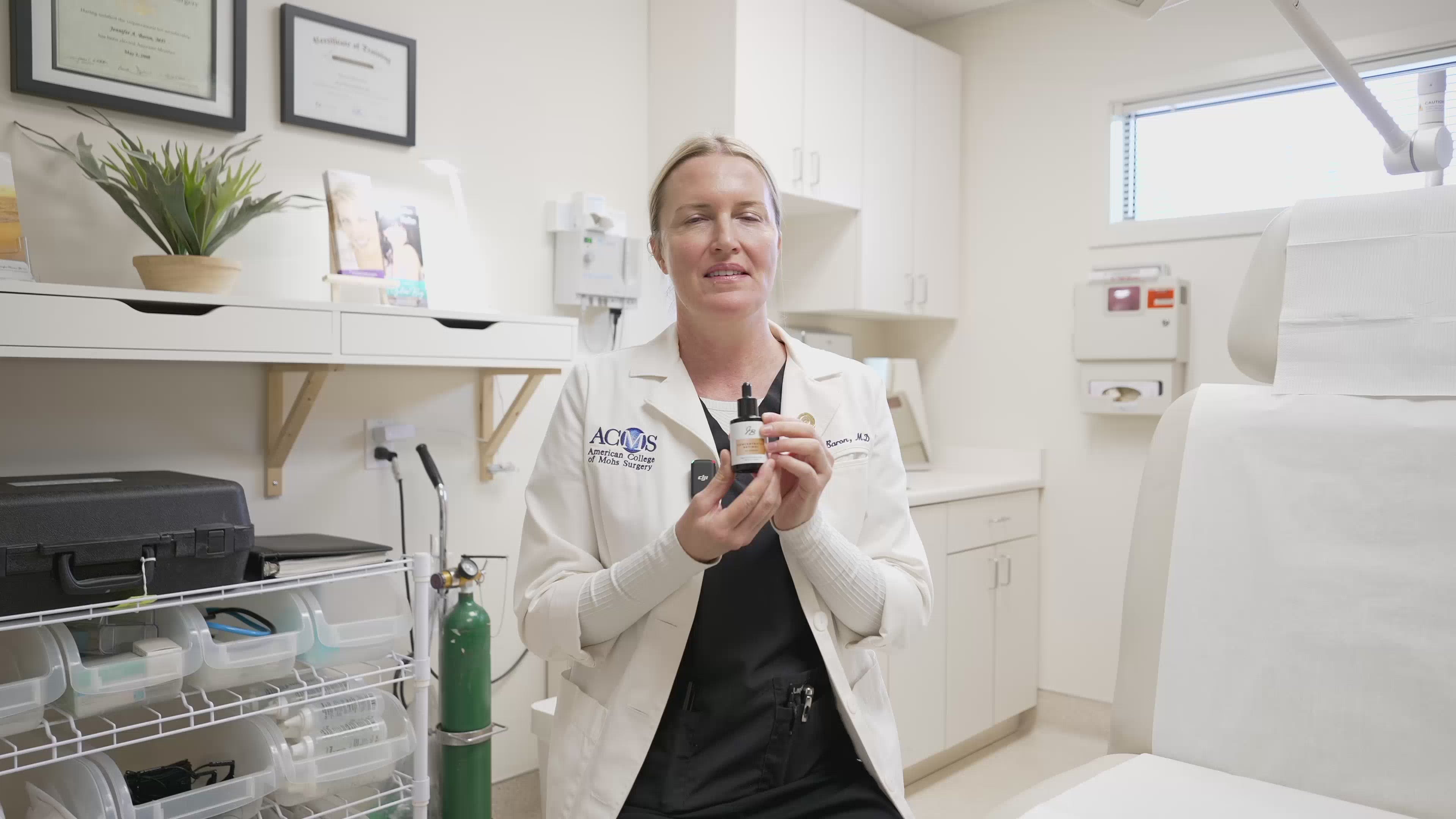 2) Using your palm, apply 3 - 5 drops evenly over entire face, eyelids, neck, upper chest and tops of hands, allow to dry about a minute